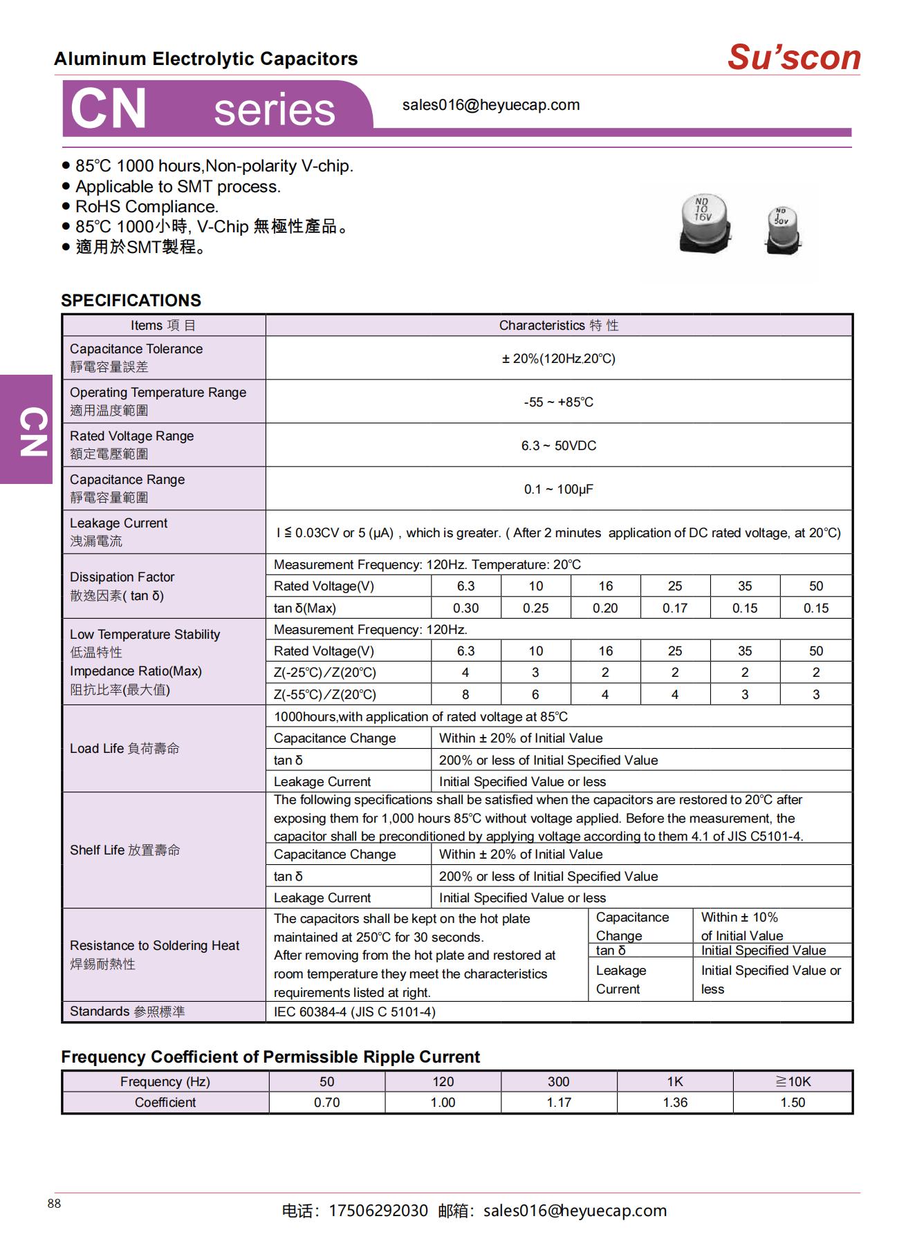 ● 85℃ 1000 hours,Non-polarity V-chip.● Applicable to SMT process. ● RoHS Compliance.● 85℃ 1000小時, V-Chip 無極性產品。● 適用於SMT製程。