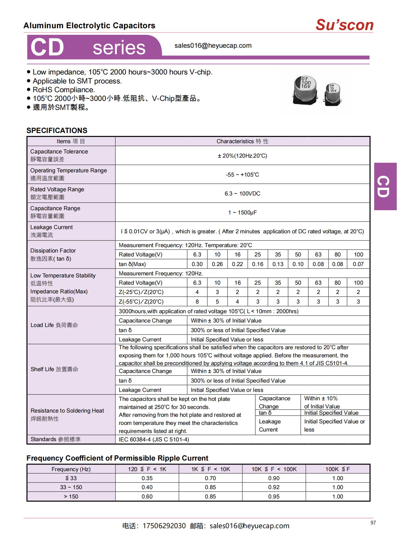● Low impedance, 105℃ 2000 hours~3000 hours V-chip.● Applicable to SMT process.● RoHS Compliance.● 105℃ 2000小時~3000小時.低阻抗、V-Chip型產品。● 適用於SMT製程。