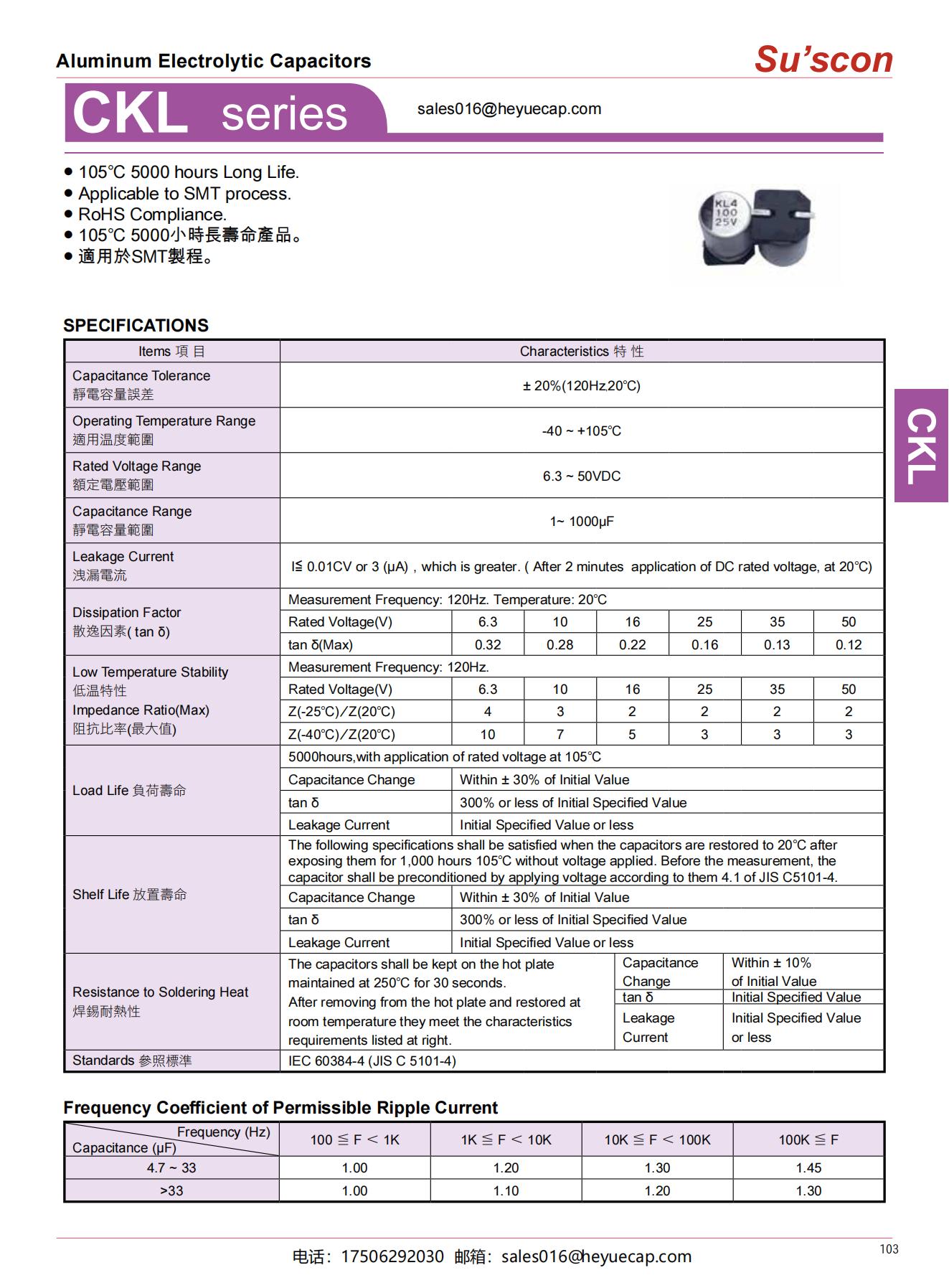 ● 105℃ 5000 hours Long Life.● Applicable to SMT process.● RoHS Compliance.● 105℃ 5000小時長壽命產品。● 適用於SMT製程。