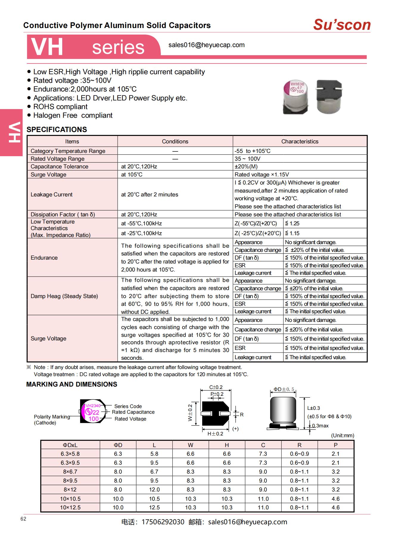 ● Low ESR,High Voltage ,High ripplie current capability● Rated voltage :35~100V● Endurance:2,000hours at 105℃● Applications: LED Drver,LED Power Supply etc.● ROHS compliant ● Halogen Free compliant