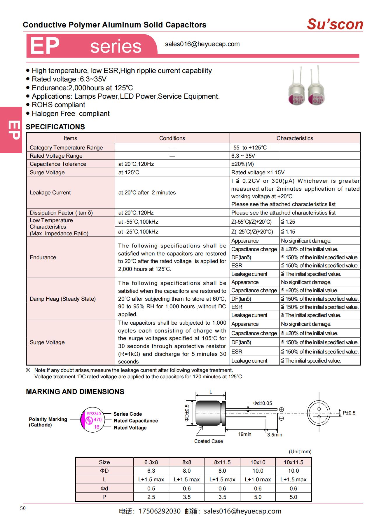 ● High temperature, low ESR,High ripplie current capability● Rated voltage :6.3~35V● Endurance:2,000hours at 125℃● Applications: Lamps Power,LED Power,Service Equipment.● ROHS compliant● Halogen Free compliant