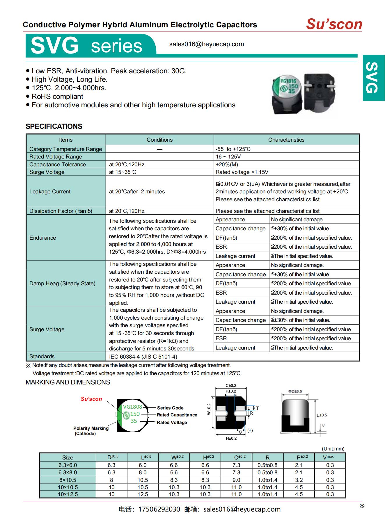● Low ESR, Anti-vibration, Peak acceleration: 30G.● High Voltage, Long Life.● 125℃, 2,000~4,000hrs.● RoHS compliant● For automotive modules and other high temperature applications