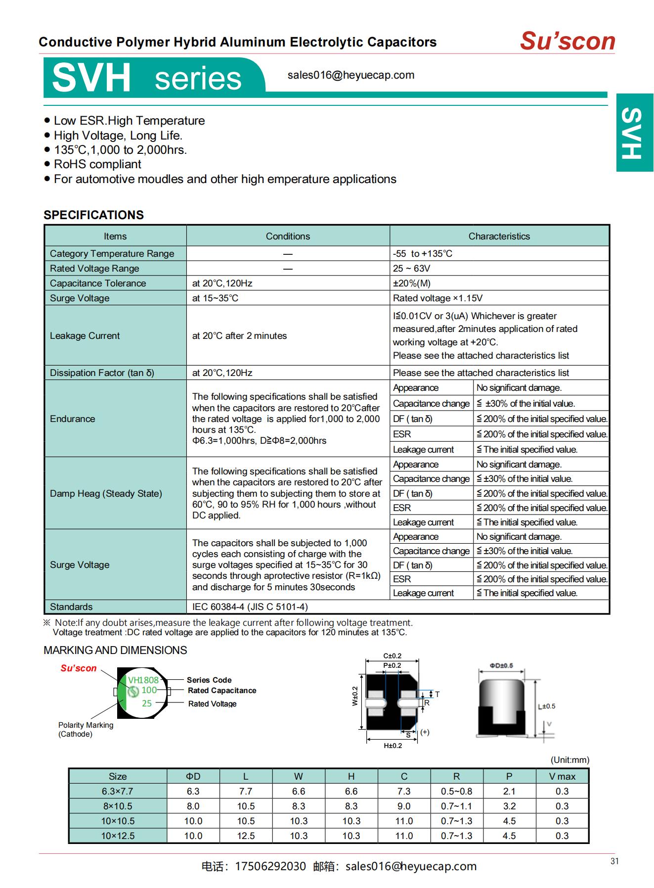 ● Low ESR.High Temperature,Peak acceleration: 30G.● High Voltage, Long Life.● 135℃,1,000 to 2,000hrs.● RoHS compliant● For automotive moudles and other high emperature applications