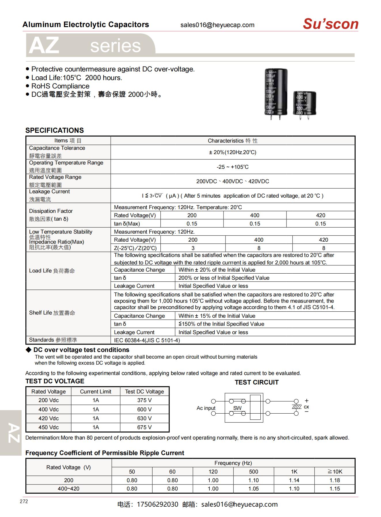 ● Protective countermeasure against DC over-voltage.● Load Life:105℃ 2000 hours.● RoHS Compliance● DC過電壓安全對策,壽命保證 2000小時。