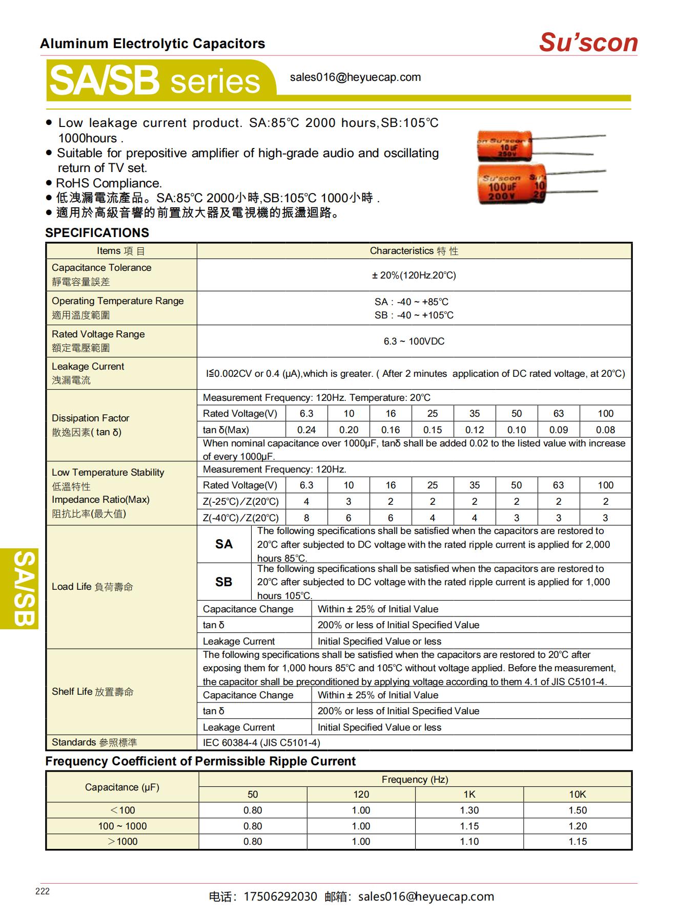 ● Low leakage current product. SA:85℃ 2000 hours,SB:105℃ 1000hours .● Suitable for prepositive amplifier of high-grade audio and oscillating return of TV set. ● RoHS Compliance. ● 低洩漏電流產品。SA:85℃ 2000小時,SB:105℃ 1000小時 .● 適用於高級音響的前置放大器及電視機的振盪迴路。