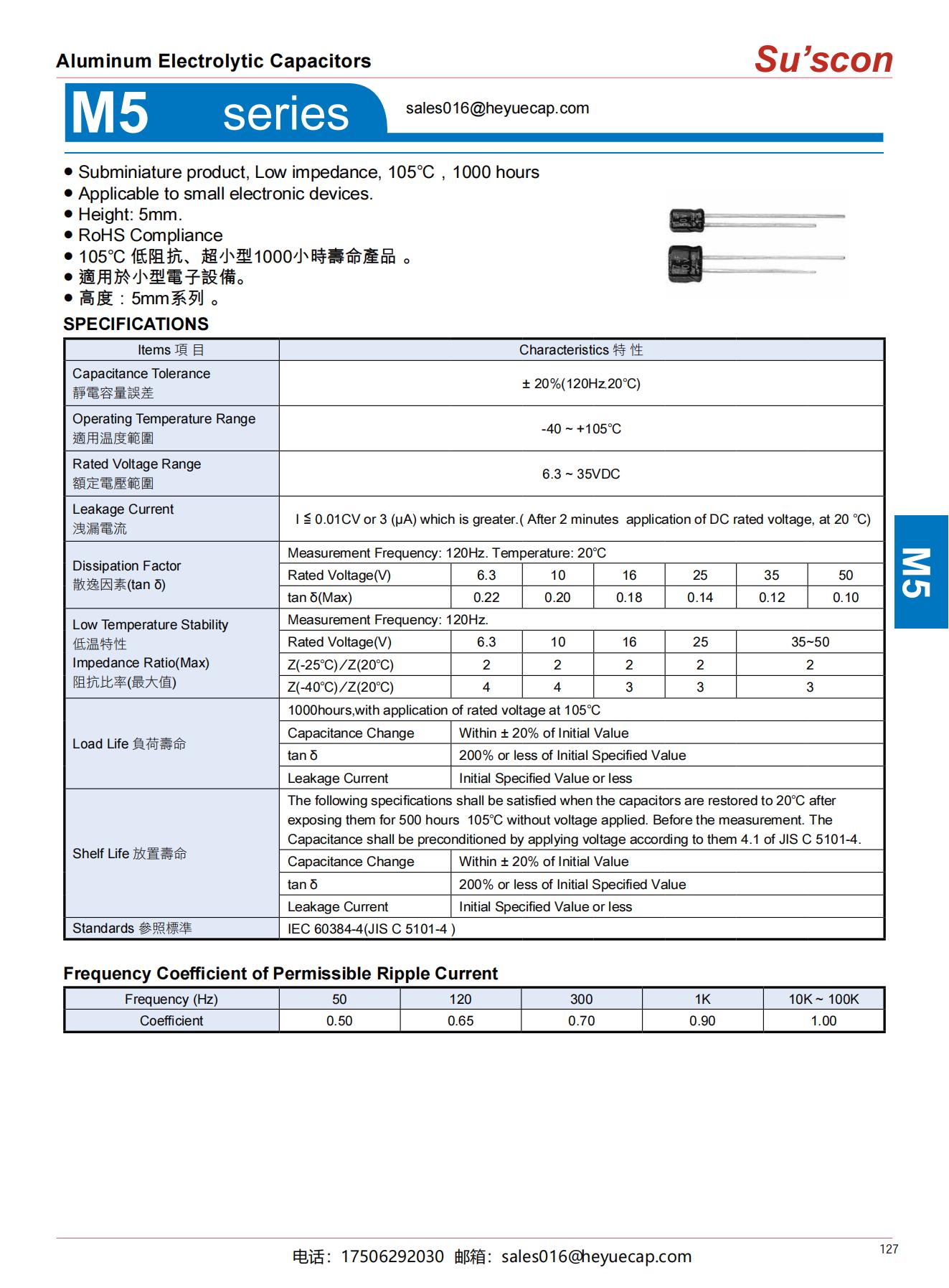 ● Subminiature product, Low impedance, 105℃,1000 hours● Applicable to small electronic devices.● Height: 5mm.● RoHS Compliance● 105℃ 低阻抗、超小型1000小時壽命產品 。● 適用於小型電子設備。● 高度:5mm系列 。