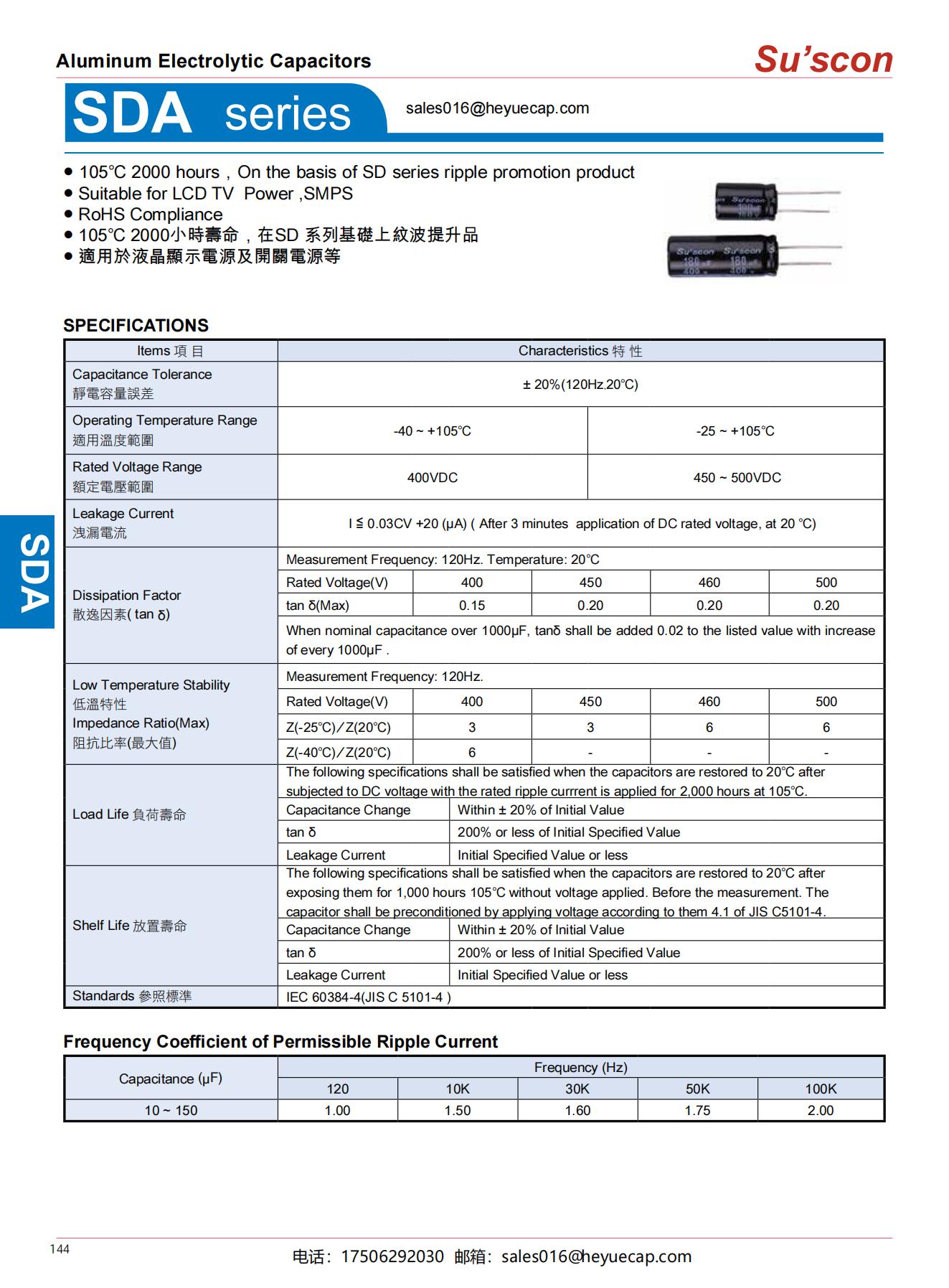 ● 105℃ 2000 hours,On the basis of SD series ripple promotion product● Suitable for LCD TV Power ,SMPS ● RoHS Compliance● 105℃ 2000小時壽命,在SD 系列基礎上紋波提升品● 適用於液晶顯示電源及開關電源等