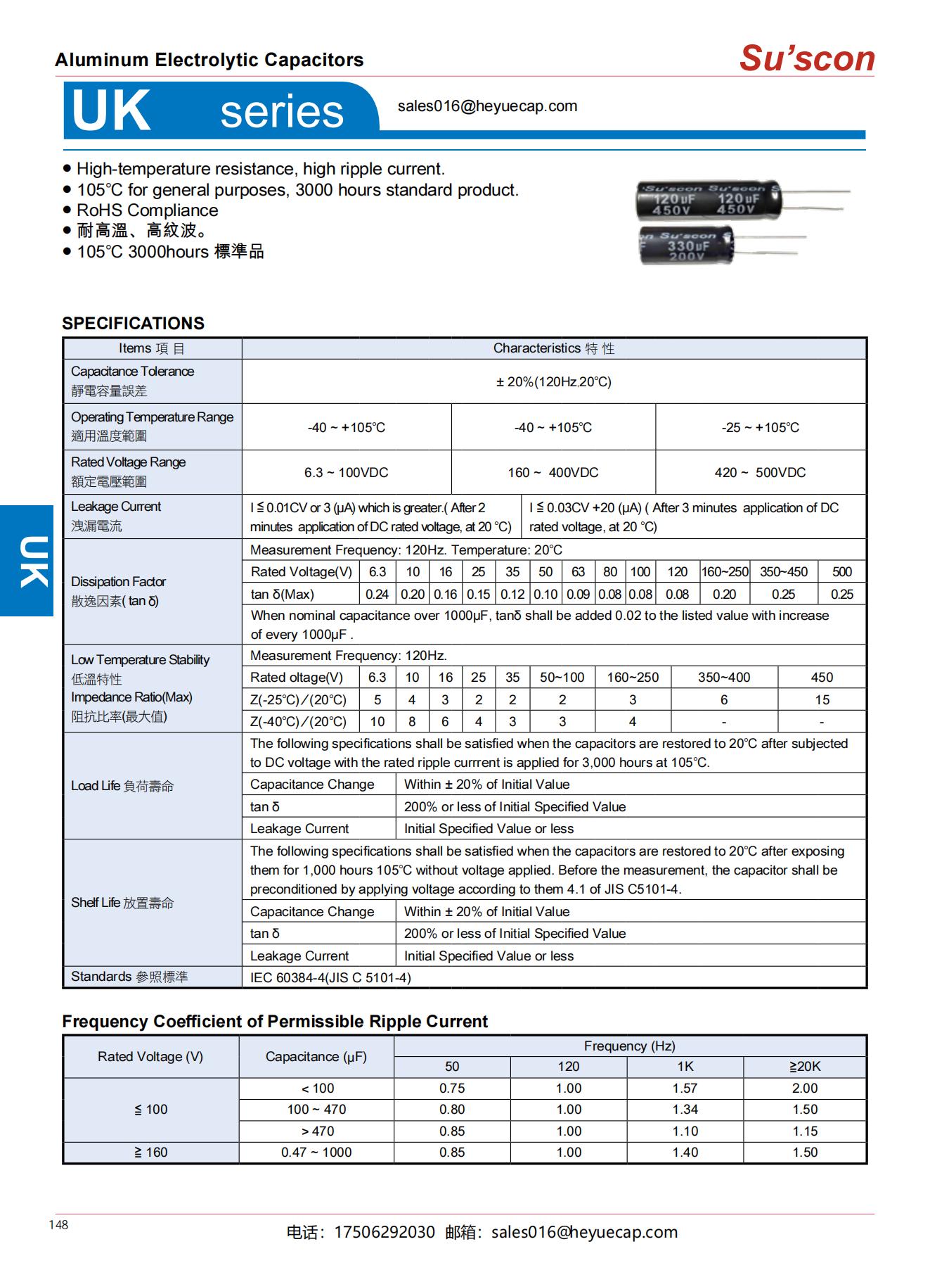 ● High-temperature resistance, high ripple current.● 105℃ for general purposes, 3000 hours standard product. ● RoHS Compliance ● 耐高溫、高紋波。 ● 105℃ 3000hours 標準品