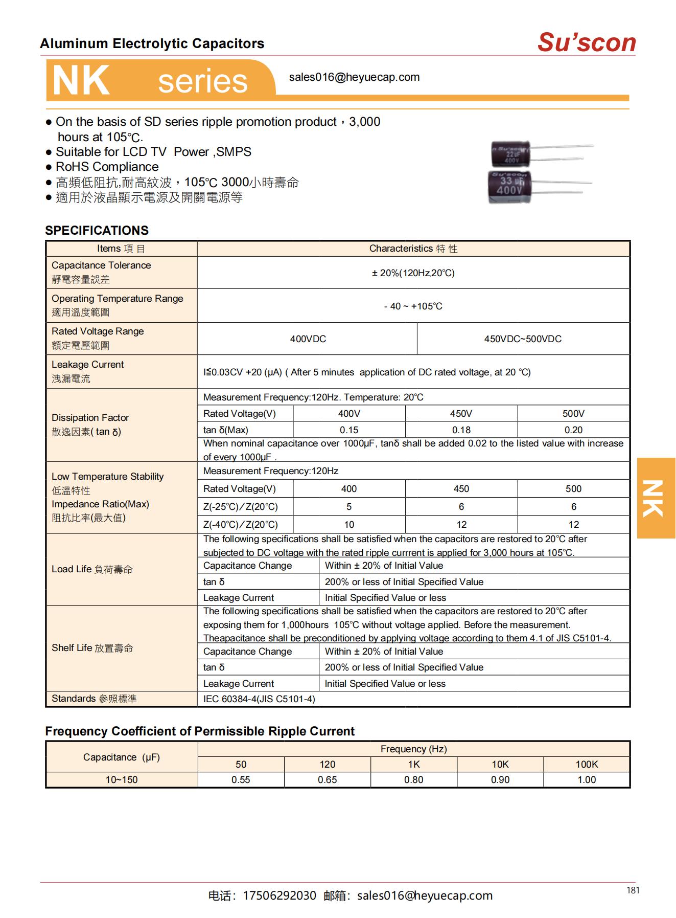 ● On the basis of SD series ripple promotion product,3,000 hours at 105℃. ● Suitable for LCD TV Power ,SMPS ● RoHS Compliance ● 高頻低阻抗,耐高紋波,105℃ 3000小時壽命● 適用於液晶顯示電源及開關電源等