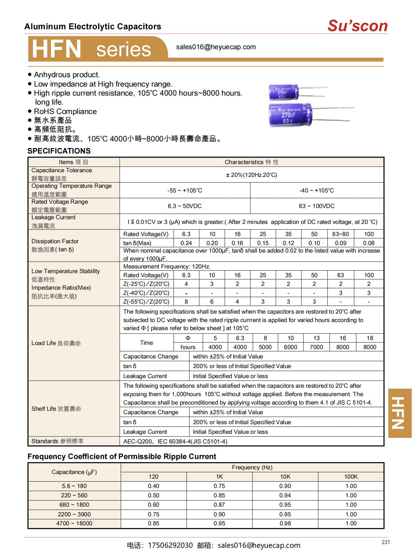 ● Anhydrous product.● Low impedance at High frequency range. ● High ripple current resistance, 105℃ 4000 hours~8000 hours.long life.● RoHS Compliance ● 無水系產品 ● 高頻低阻抗。 ● 耐高紋波電流、105℃ 4000小時~8000小時長壽命產品。