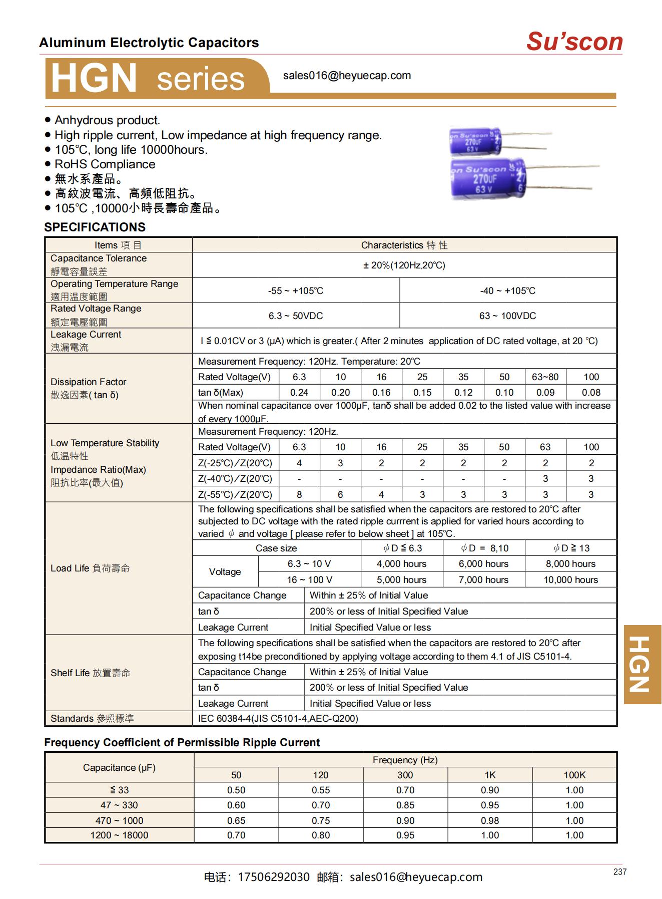 ● Anhydrous product.● High ripple current, Low impedance at high frequency range. ● 105℃, long life 10000hours.● RoHS Compliance● 無水系產品。● 高紋波電流、高頻低阻抗。● 105℃ ,10000小時長壽命產品。