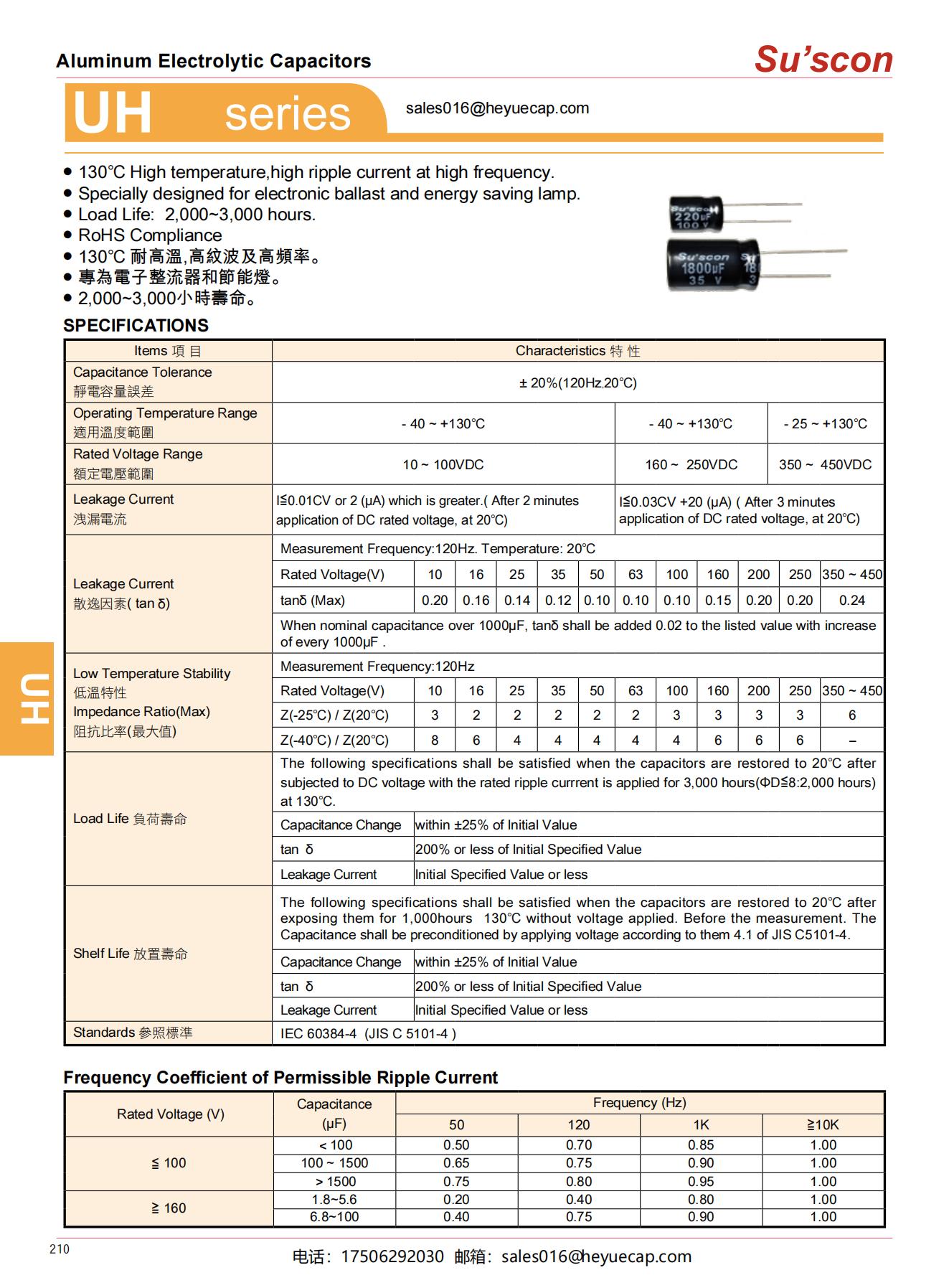 ● 130℃ High temperature,high ripple current at high frequency.● Specially designed for electronic ballast and energy saving lamp.● Load Life: 2,000~3,000 hours.● RoHS Compliance● 130℃ 耐高溫,高紋波及高頻率。● 專為電子整流器和節能燈。● 2,000~3,000小時壽命。