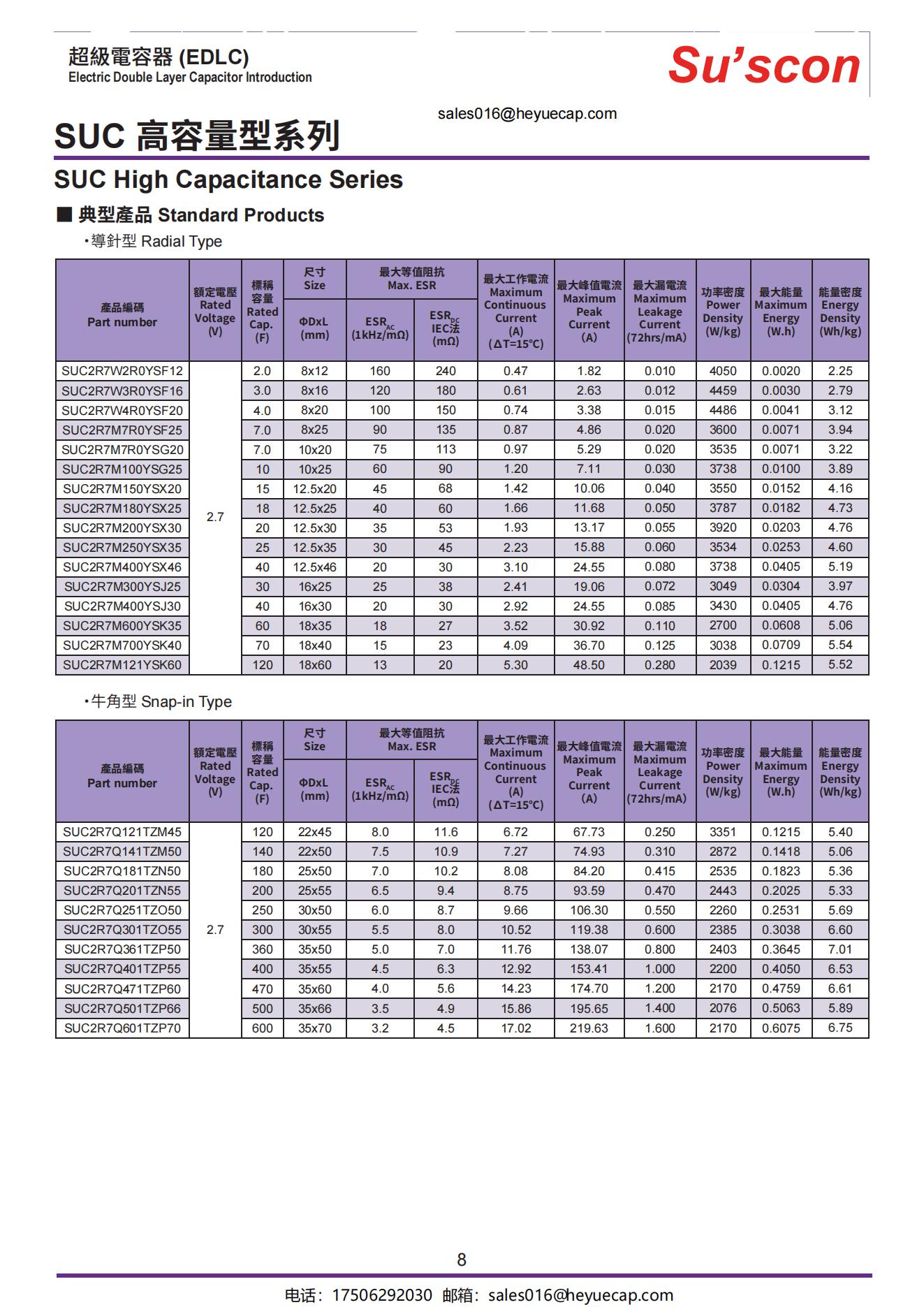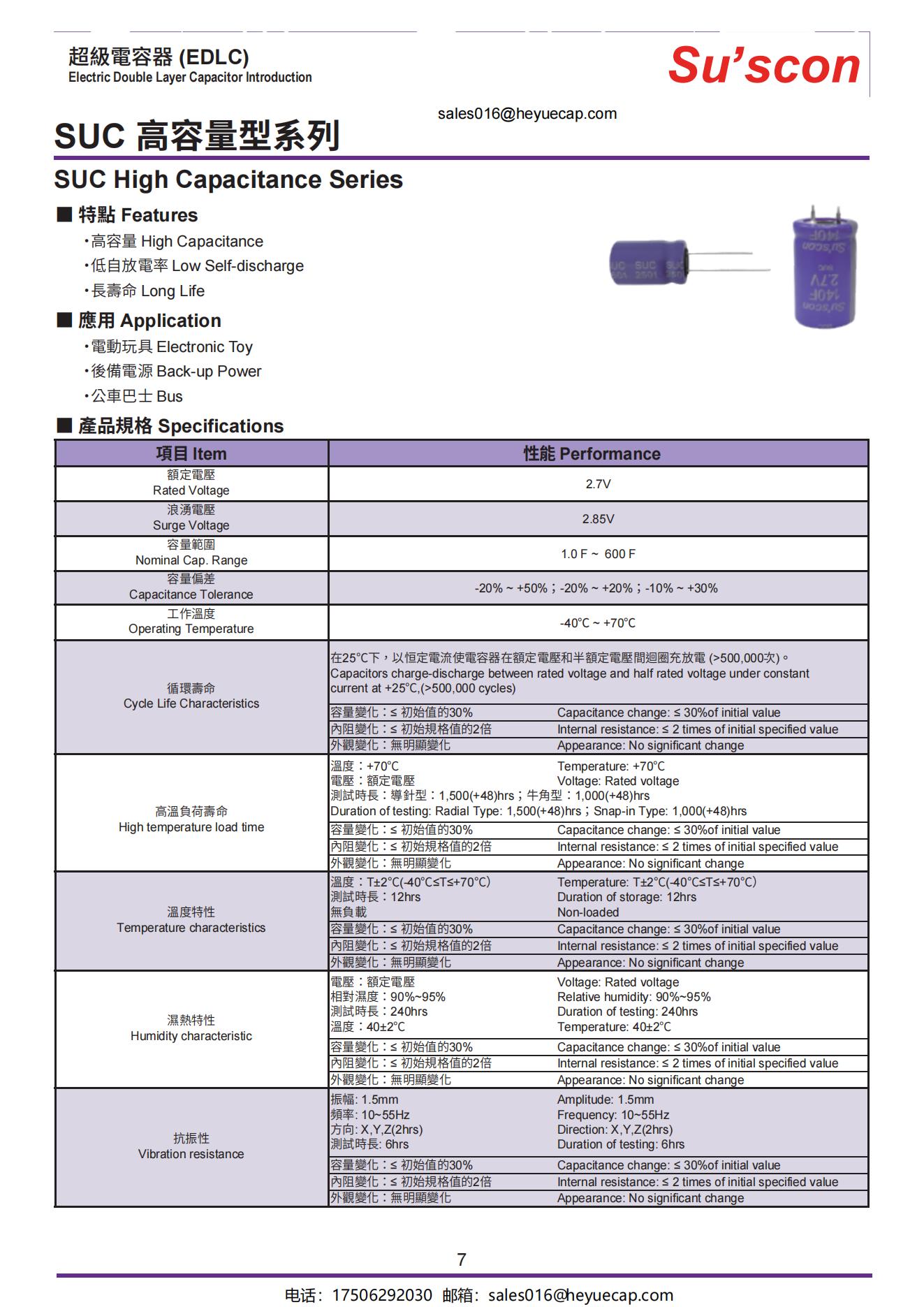 ·高容量 High capacitance·工作溫度 Operating temperature:-40°C~ +70°C·額定電壓 Rated voltage:2.7V·尺寸Size: Φ8 ~Φ35·循環次數 Life cycles:>500,000次
