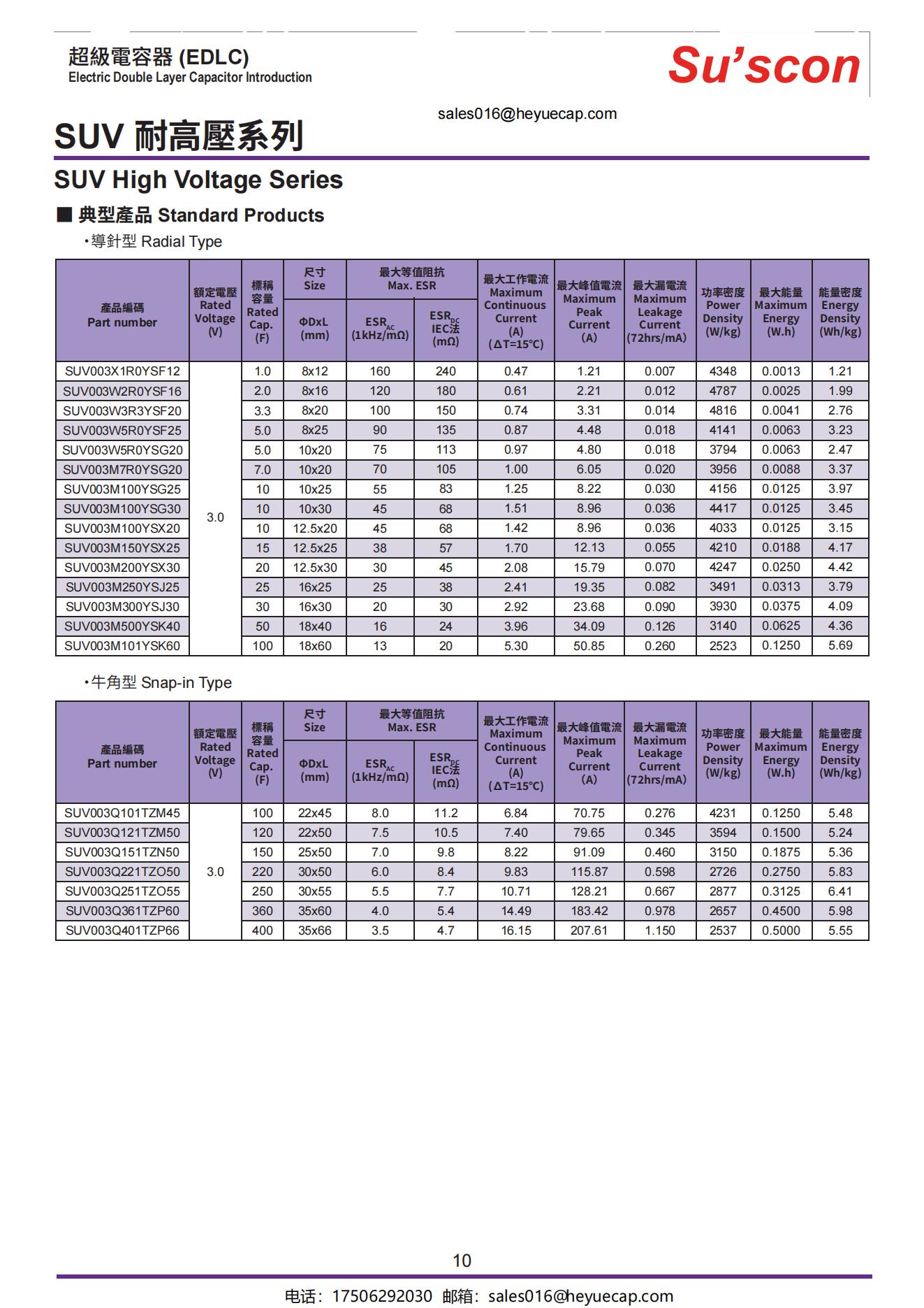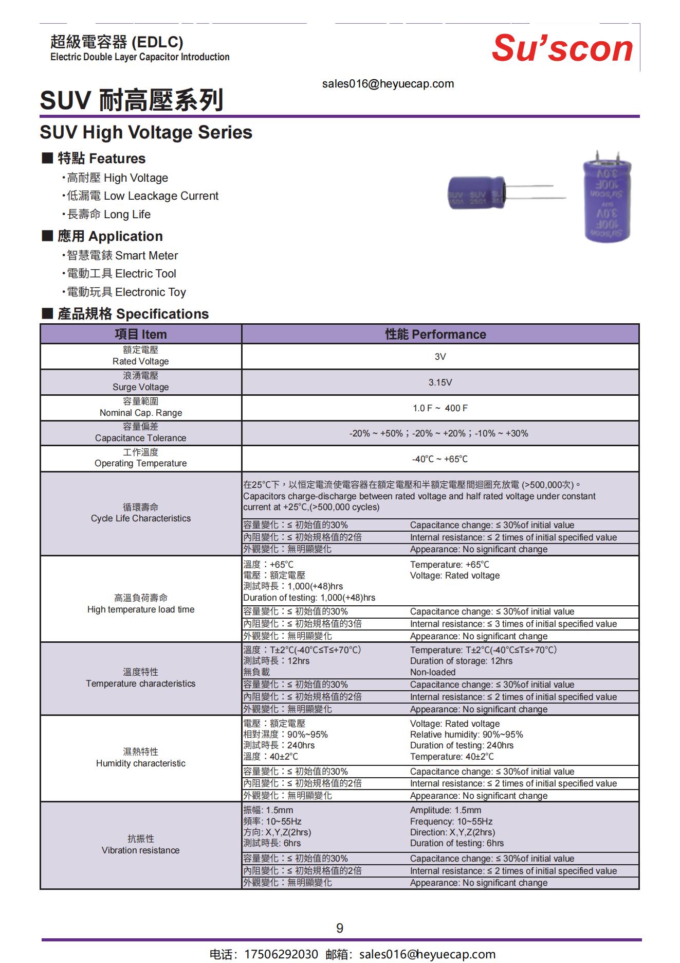·高電壓 High voltage·工作溫度Operating temperature:-40°C~+65°C·額定電壓Rated voltage:3.0V·尺寸Size:Φ8 ~Φ35·循環次數 Life cycles:>500,000次