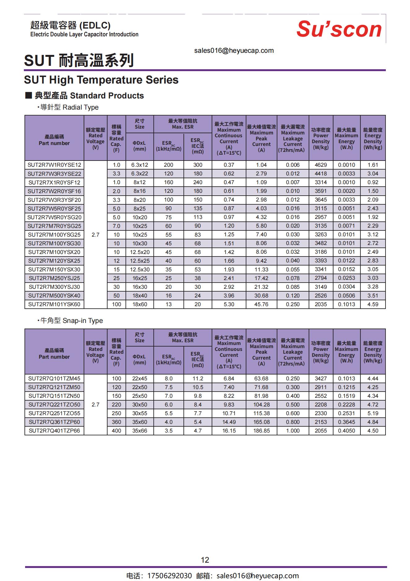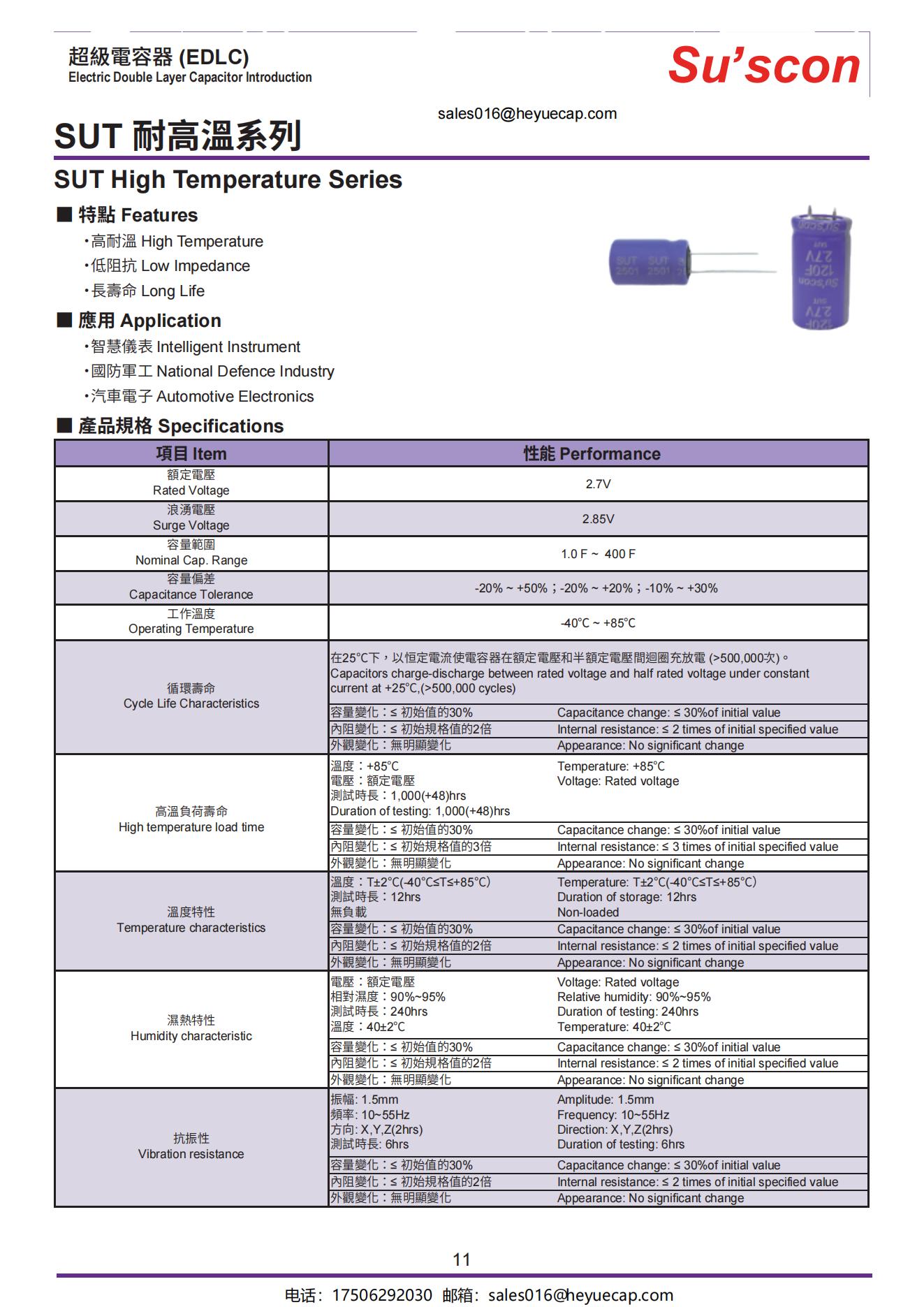 ·高溫度 High temperature·工作溫度 Operating temperature:-40°C~+85°C·額定電壓 Rated voltage:2.7V·尺寸 Size: Φ6.3 ~ Φ35·循環次數 Life cycles:>500,000次